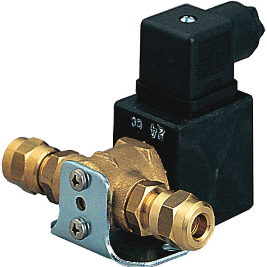 Valvola solenoide speciale completa di raccordi per tubo da Ø 8 mm esterno. Indicata per montaggio trombe in coppia.