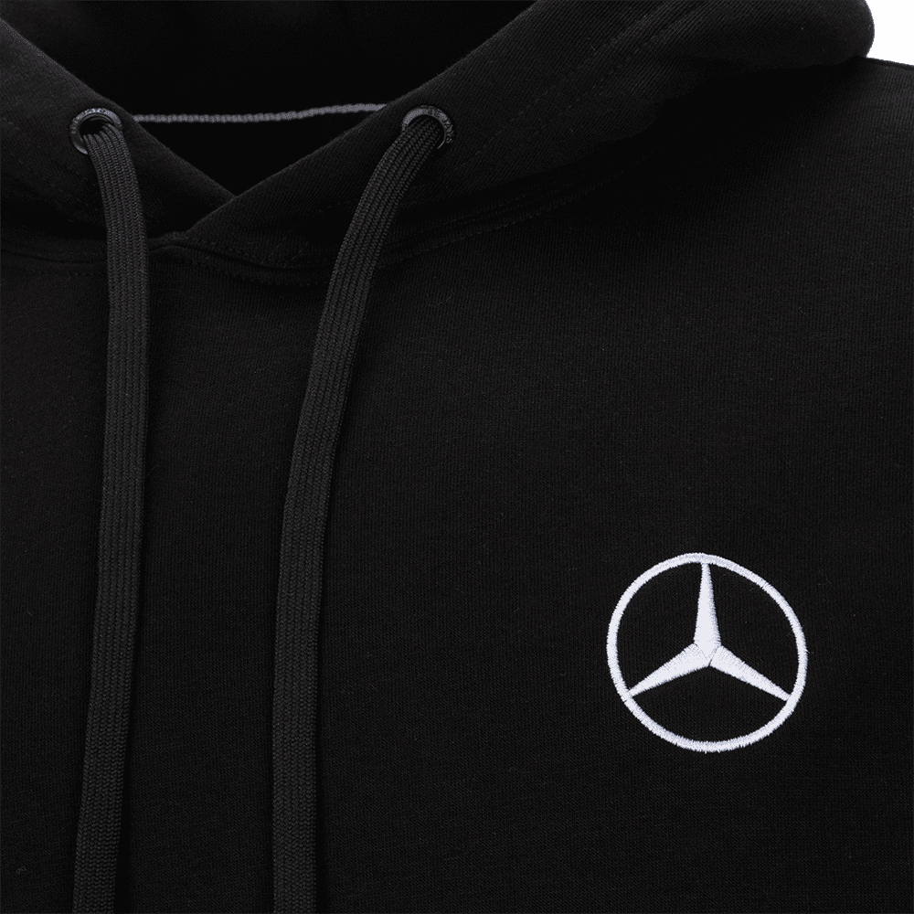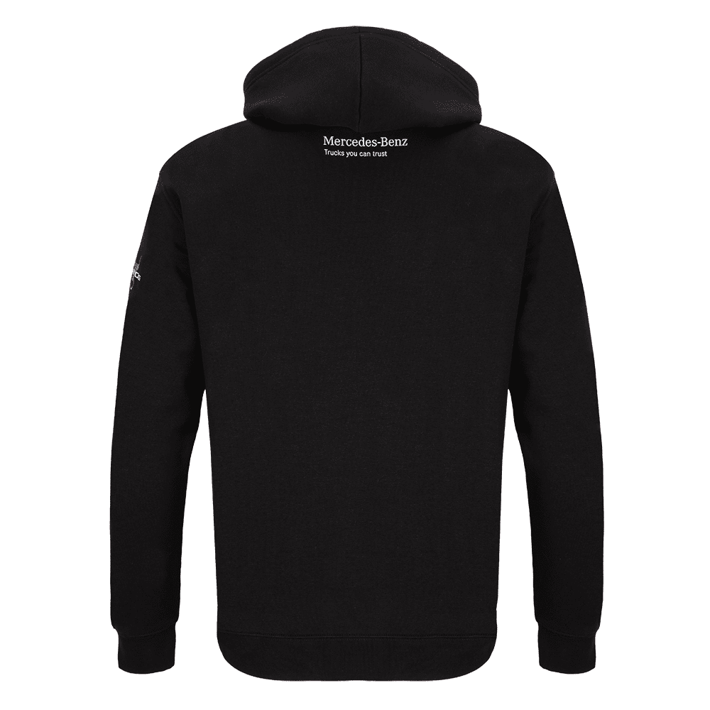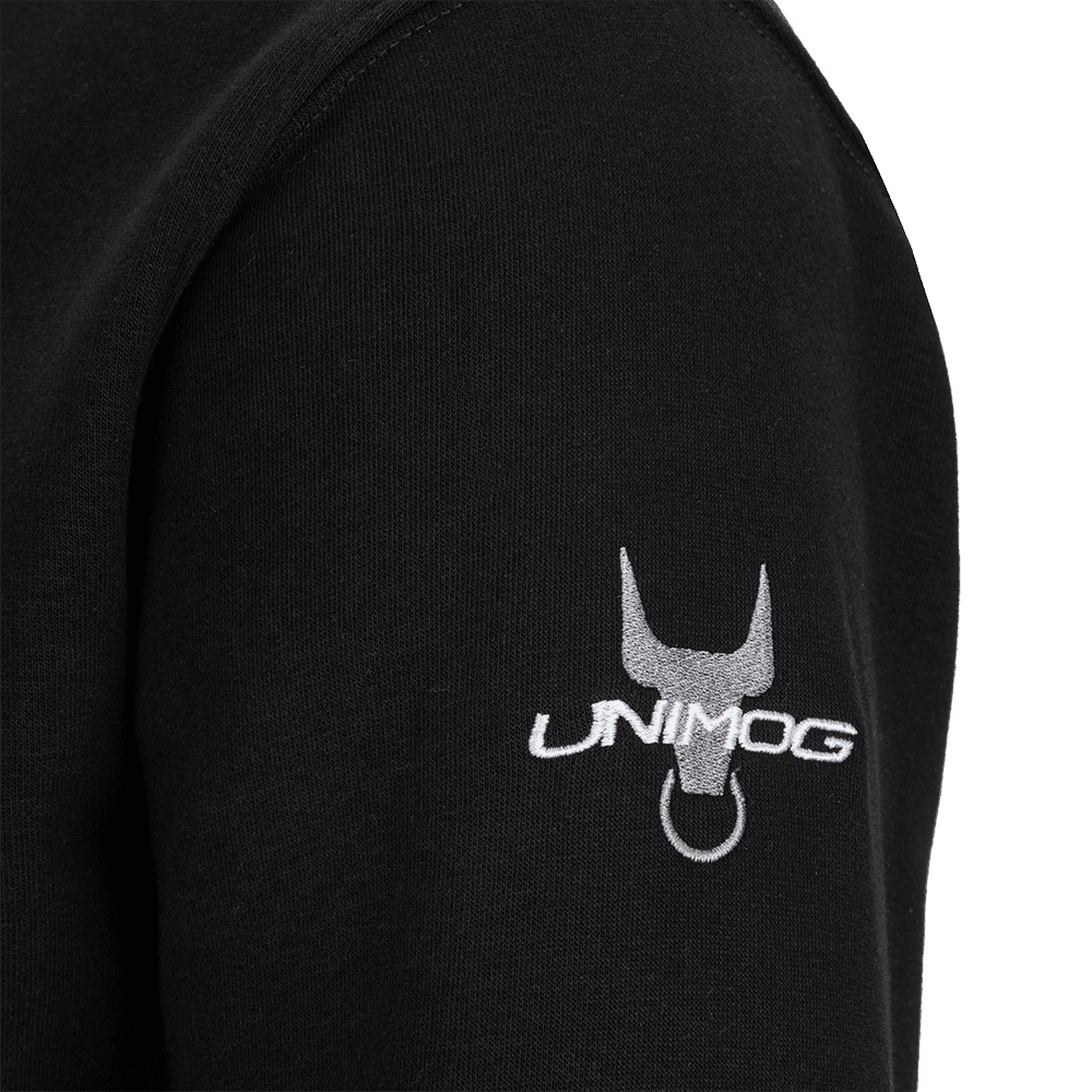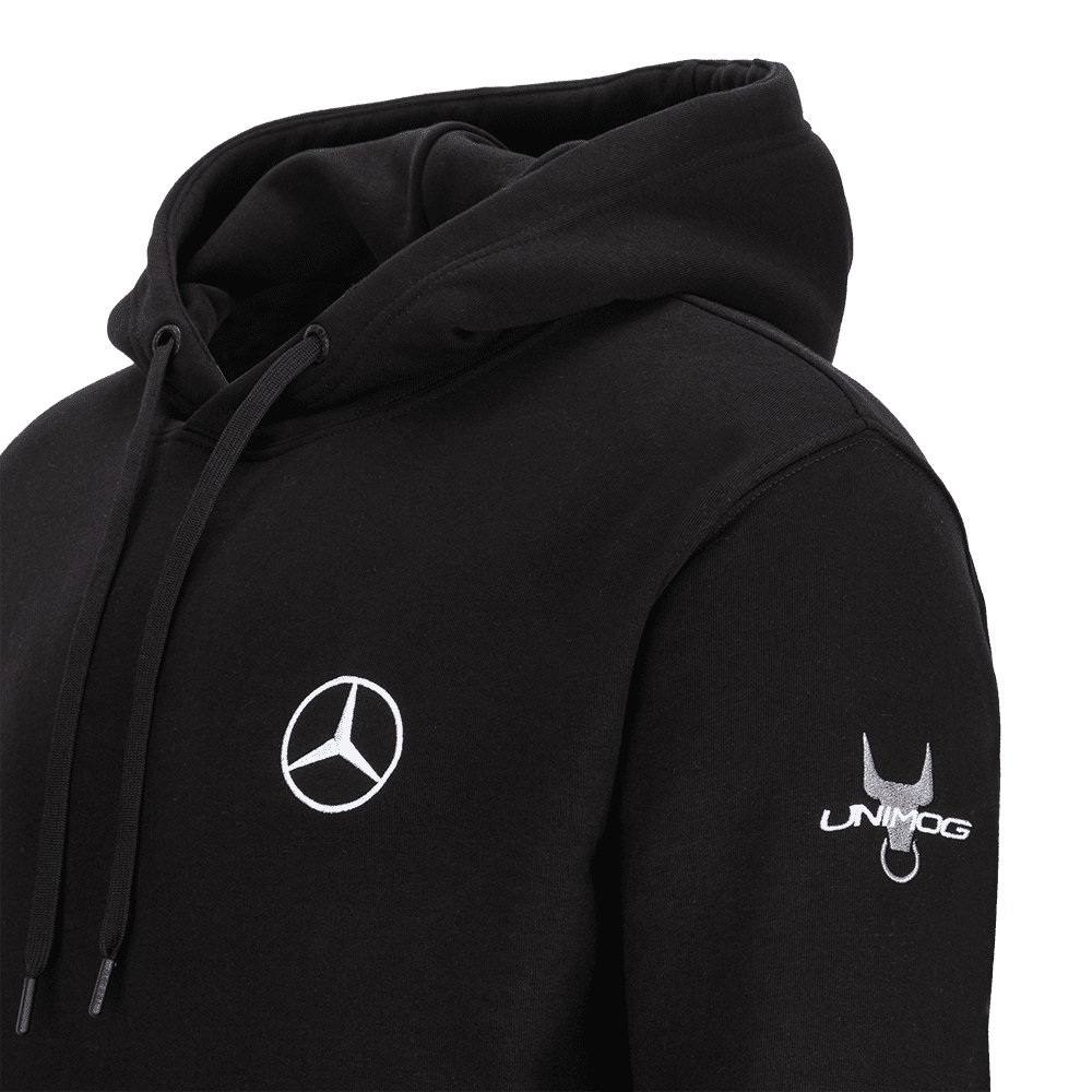 Felpa con cappuccio nera unisex, caratterizzata dalla stella Mercedes-Benz Trucks sul petto a sinistra, dal marchio Unimog sulla manica sinistra e dal marchio sulla schiena.