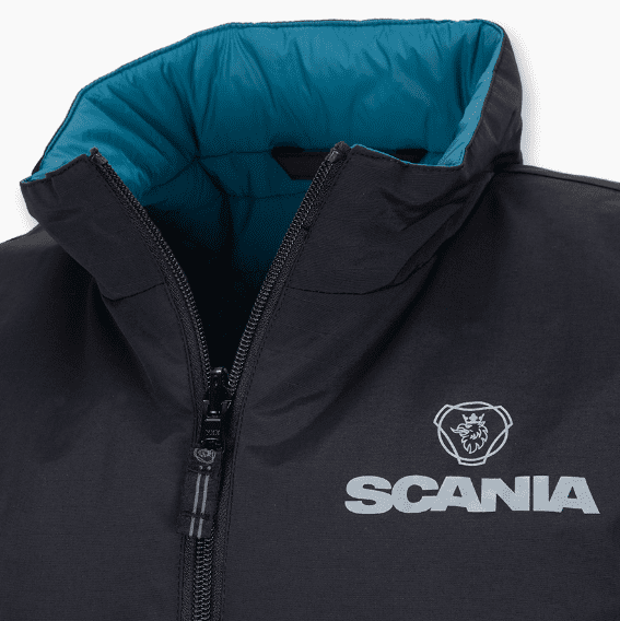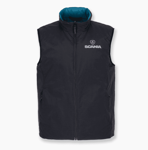 Dettagli: Gilet reversibile bicolore, stampa con logo Scania e stampa con grifone piccolo argento riflettente. Cerniera reversibile con logo sul davanti. Tasche nascoste con cerniera.