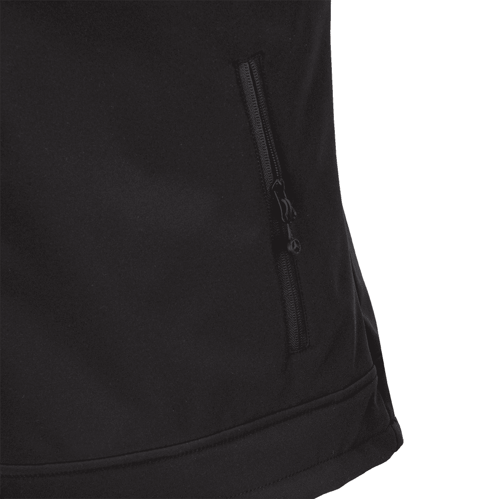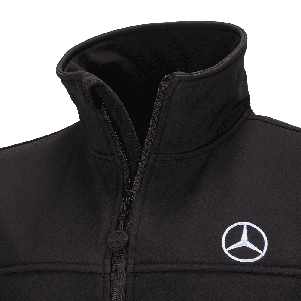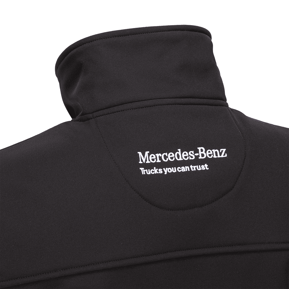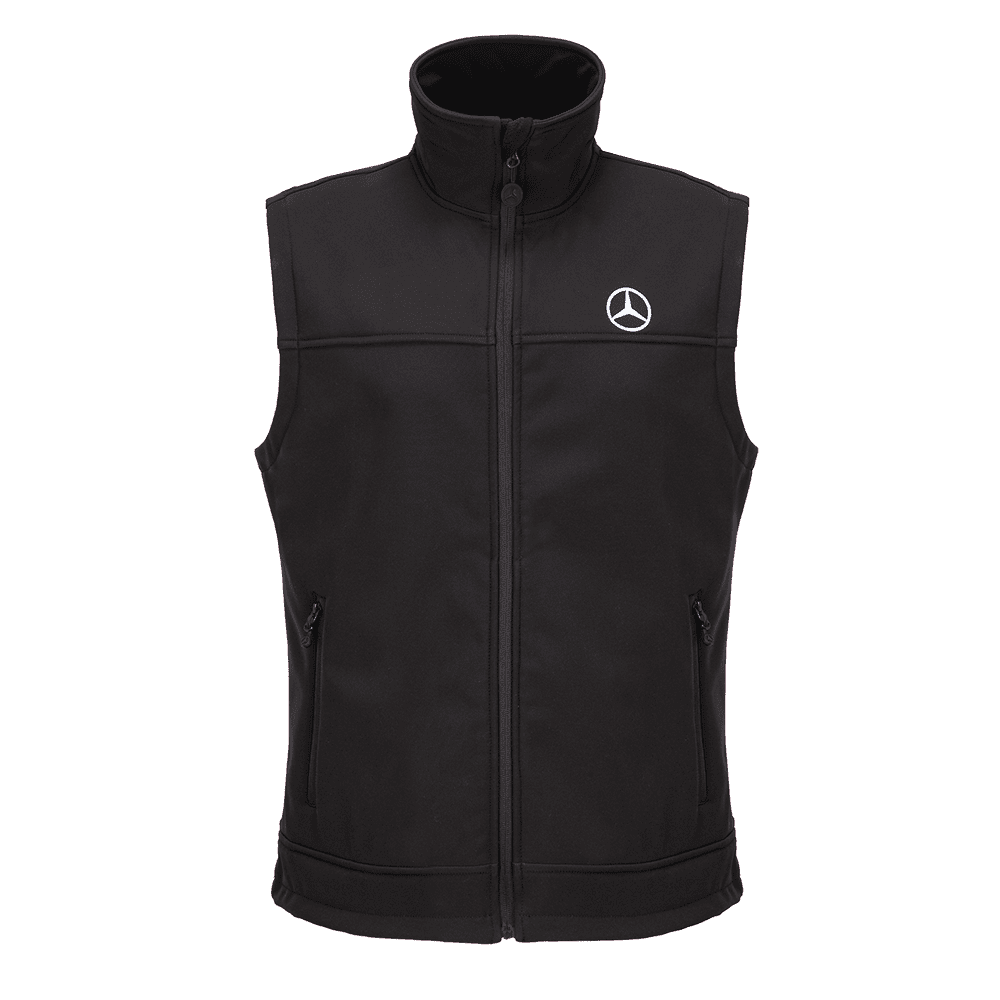 Gilet softshell nero con zip intera, logo Mercedes-Benz Trucks ricamato sul petto a sinistra, due tasche con zip e dettagli gialli.